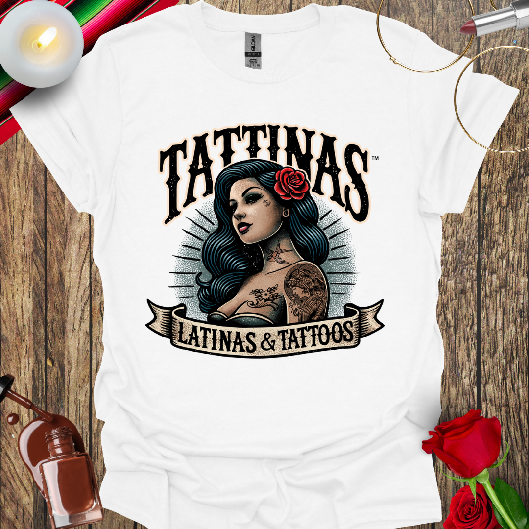 TATTINAS™ Latinas & Tattoos - Classic Portrait with Rose in Hair T-shirt (Dark Print) More Colors Available